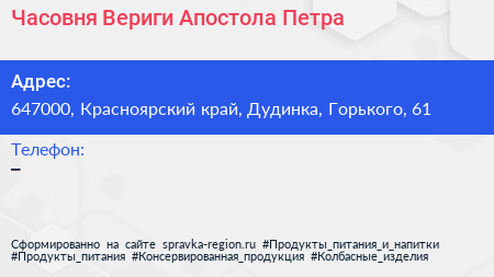 Часовня Вериги Апостола Петра по адресу 647000, Красноярский край, Дудинка, Горького, 61 в дальнейшем Организация, размещена в следующих категориях: