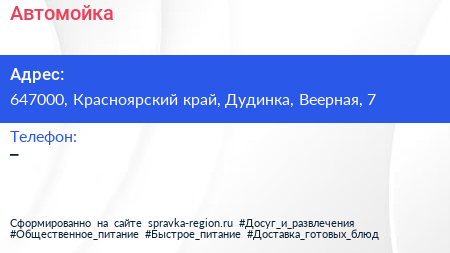 Автомойка по адресу 647000, Красноярский край, Дудинка, Веерная, 7 в дальнейшем Организация, размещена в следующих категориях:
