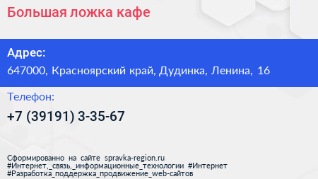 Большая ложка, кафе по адресу 647000, Красноярский край, Дудинка, Ленина, 16 в дальнейшем Организация, размещена в следующих категориях: