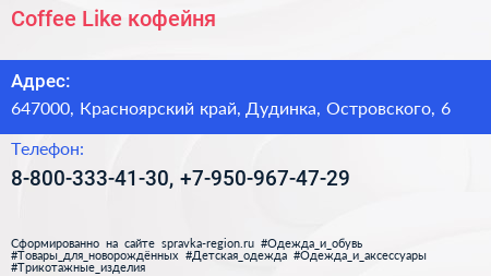 Coffee Like, кофейня по адресу 647000, Красноярский край, Дудинка, Островского, 6 в дальнейшем Организация, размещена в следующих категориях: