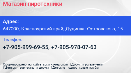 Магазин пиротехники по адресу 647000, Красноярский край, Дудинка, Островского, 15 в дальнейшем Организация, размещена в следующих категориях: