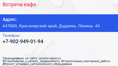 Встреча, кафе по адресу 647000, Красноярский край, Дудинка, Ленина, 44 в дальнейшем Организация, размещена в следующих категориях: