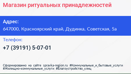 Магазин ритуальных принадлежностей по адресу 647000, Красноярский край, Дудинка, Советская, 5а в дальнейшем Организация, размещена в следующих категориях:
