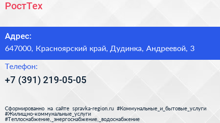 РостТех по адресу 647000, Красноярский край, Дудинка, Андреевой, 3 в дальнейшем Организация, размещена в следующих категориях: