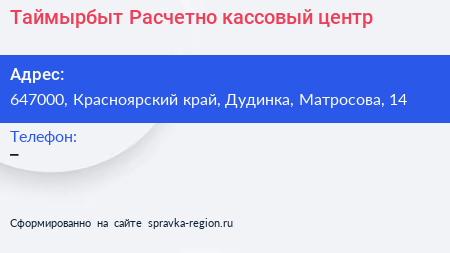 Таймырбыт, Расчетно-кассовый центр по адресу 647000, Красноярский край, Дудинка, Матросова, 14 в дальнейшем Организация, размещена в следующих категориях: