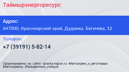 Таймырэнергоресурс по адресу 647000, Красноярский край, Дудинка, Бегичева, 12 в дальнейшем Организация, размещена в следующих категориях: