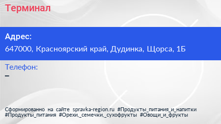 Терминал по адресу 647000, Красноярский край, Дудинка, Щорса, 1Б в дальнейшем Организация, размещена в следующих категориях: