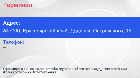 Терминал по адресу 647000, Красноярский край, Дудинка, Островского, 15 в дальнейшем Организация, размещена в следующих категориях: