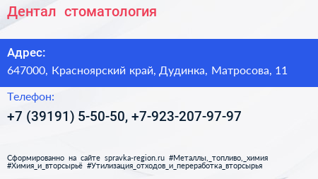 Дентал+, стоматология по адресу 647000, Красноярский край, Дудинка, Матросова, 11 в дальнейшем Организация, размещена в следующих категориях: