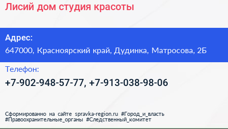 Лисий дом, студия красоты по адресу 647000, Красноярский край, Дудинка, Матросова, 2Б в дальнейшем Организация, размещена в следующих категориях: