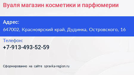 Вуаля, магазин косметики и парфюмерии по адресу 647002, Красноярский край, Дудинка, Островского, 16 в дальнейшем Организация, размещена в следующих категориях: