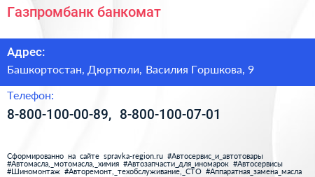 Газпромбанк, банкомат по адресу Башкортостан, Дюртюли, Василия Горшкова, 9 в дальнейшем Организация, размещена в следующих категориях: