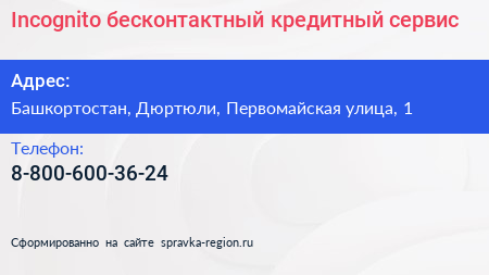 Incognito, бесконтактный кредитный сервис по адресу Башкортостан, Дюртюли, Первомайская улица, 1 в дальнейшем Организация, размещена в следующих категориях: