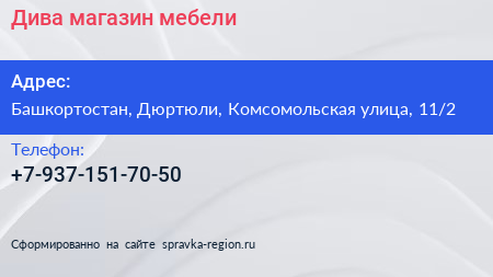 Дива, магазин мебели по адресу Башкортостан, Дюртюли, Комсомольская улица, 11/2 в дальнейшем Организация, размещена в следующих категориях: