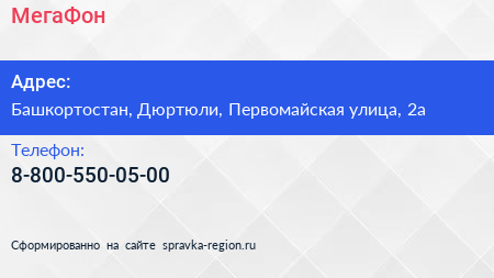 МегаФон по адресу Башкортостан, Дюртюли, Первомайская улица, 2а в дальнейшем Организация, размещена в следующих категориях: