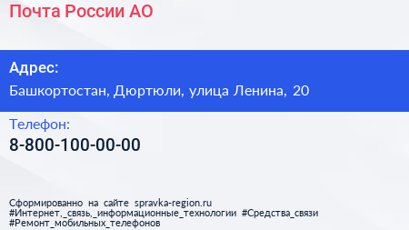 Почта России, АО по адресу Башкортостан, Дюртюли, улица Ленина, 20 в дальнейшем Организация, размещена в следующих категориях: