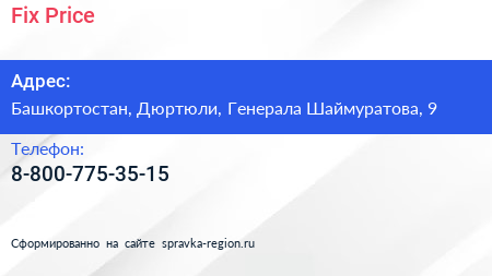 Fix Price по адресу Башкортостан, Дюртюли, Генерала Шаймуратова, 9 в дальнейшем Организация, размещена в следующих категориях: