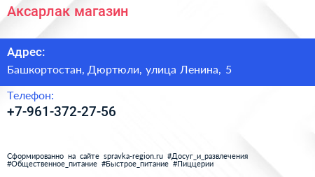 Аксарлак, магазин по адресу Башкортостан, Дюртюли, улица Ленина, 5 в дальнейшем Организация, размещена в следующих категориях:
