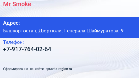 Mr. Smoke по адресу Башкортостан, Дюртюли, Генерала Шаймуратова, 9 в дальнейшем Организация, размещена в следующих категориях:
