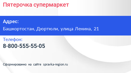 Пятерочка, супермаркет по адресу Башкортостан, Дюртюли, улица Ленина, 21 в дальнейшем Организация, размещена в следующих категориях: