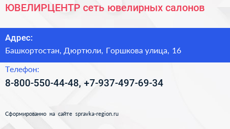 ЮВЕЛИРЦЕНТР, сеть ювелирных салонов по адресу Башкортостан, Дюртюли, Горшкова улица, 16 в дальнейшем Организация, размещена в следующих категориях: