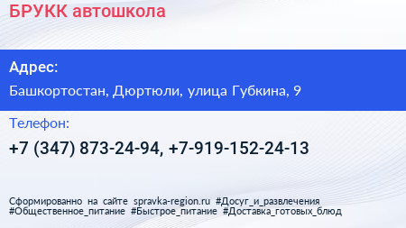БРУКК, автошкола по адресу Башкортостан, Дюртюли, улица Губкина, 9 в дальнейшем Организация, размещена в следующих категориях: