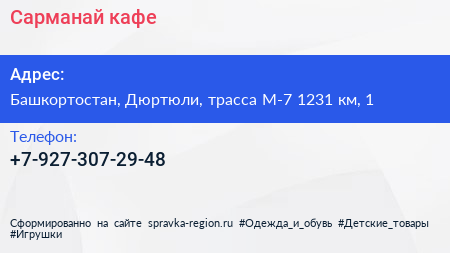 Сарманай, кафе по адресу Башкортостан, Дюртюли, трасса М-7 1231 км, 1 в дальнейшем Организация, размещена в следующих категориях: