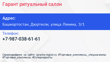 Гарант, ритуальный салон по адресу Башкортостан, Дюртюли, улица Ленина, 3/1 в дальнейшем Организация, размещена в следующих категориях: