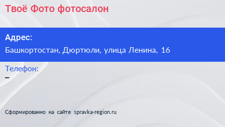 Твоё Фото, фотосалон по адресу Башкортостан, Дюртюли, улица Ленина, 16 в дальнейшем Организация, размещена в следующих категориях: