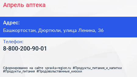 Апрель, аптека по адресу Башкортостан, Дюртюли, улица Ленина, 36 в дальнейшем Организация, размещена в следующих категориях: