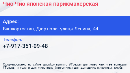 Чио Чио, японская парикмахерская по адресу Башкортостан, Дюртюли, улица Ленина, 44 в дальнейшем Организация, размещена в следующих категориях: