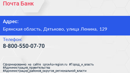 Почта Банк по адресу Брянская область, Дятьково, улица Ленина, 129 в дальнейшем Организация, размещена в следующих категориях: