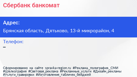Сбербанк, банкомат по адресу Брянская область, Дятьково, 13-й микрорайон, 4 в дальнейшем Организация, размещена в следующих категориях:
