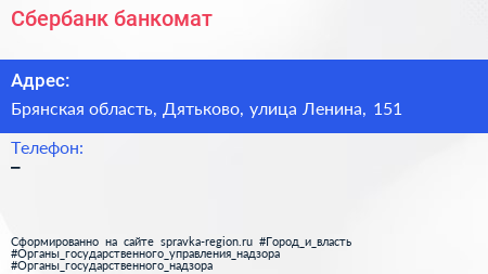 Сбербанк, банкомат по адресу Брянская область, Дятьково, улица Ленина, 151 в дальнейшем Организация, размещена в следующих категориях: