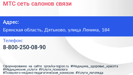 МТС, сеть салонов связи по адресу Брянская область, Дятьково, улица Ленина, 184 в дальнейшем Организация, размещена в следующих категориях: