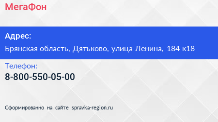 МегаФон по адресу Брянская область, Дятьково, улица Ленина, 184 к18 в дальнейшем Организация, размещена в следующих категориях: