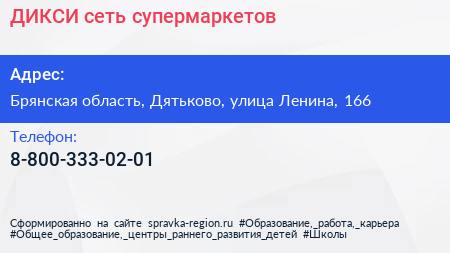 ДИКСИ, сеть супермаркетов по адресу Брянская область, Дятьково, улица Ленина, 166 в дальнейшем Организация, размещена в следующих категориях: