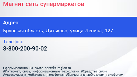 Магнит, сеть супермаркетов по адресу Брянская область, Дятьково, улица Ленина, 127 в дальнейшем Организация, размещена в следующих категориях:
