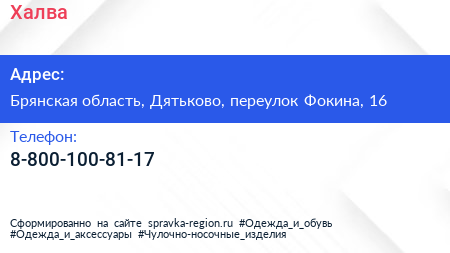 Халва по адресу Брянская область, Дятьково, переулок Фокина, 16 в дальнейшем Организация, размещена в следующих категориях: