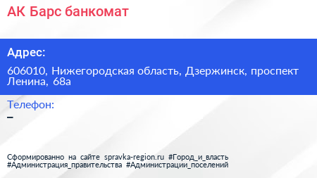 АК Барс, банкомат по адресу 606010, Нижегородская область, Дзержинск, проспект Ленина, 68а в дальнейшем Организация, размещена в следующих категориях: