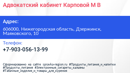 Адвокатский кабинет Карповой М.В. по адресу 606000, Нижегородская область, Дзержинск, Маяковского, 10 в дальнейшем Организация, размещена в следующих категориях: