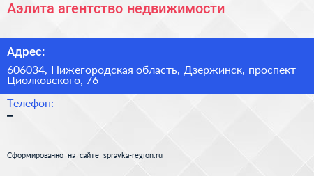 Аэлита, агентство недвижимости по адресу 606034, Нижегородская область, Дзержинск, проспект Циолковского, 76 в дальнейшем Организация, размещена в следующих категориях: