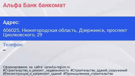 Альфа-Банк, банкомат по адресу 606025, Нижегородская область, Дзержинск, проспект Циолковского, 29 в дальнейшем Организация, размещена в следующих категориях: