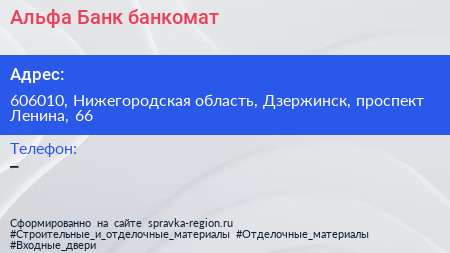 Альфа-Банк, банкомат по адресу 606010, Нижегородская область, Дзержинск, проспект Ленина, 66 в дальнейшем Организация, размещена в следующих категориях: