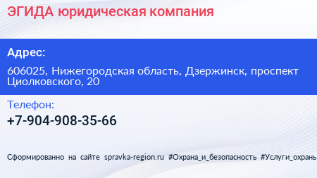 ЭГИДА, юридическая компания по адресу 606025, Нижегородская область, Дзержинск, проспект Циолковского, 20 в дальнейшем Организация, размещена в следующих категориях: