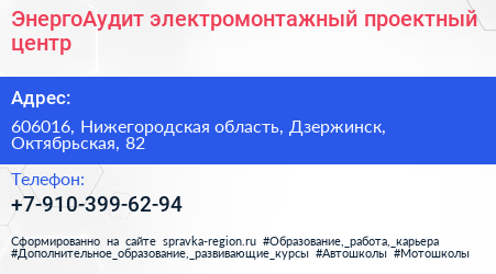 ЭнергоАудит, электромонтажный проектный центр по адресу 606016, Нижегородская область, Дзержинск, Октябрьская, 82 в дальнейшем Организация, размещена в следующих категориях: