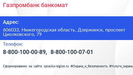 Газпромбанк, банкомат по адресу 606033, Нижегородская область, Дзержинск, проспект Циолковского, 79 в дальнейшем Организация, размещена в следующих категориях: