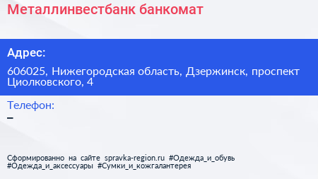 Металлинвестбанк, банкомат по адресу 606025, Нижегородская область, Дзержинск, проспект Циолковского, 4 в дальнейшем Организация, размещена в следующих категориях: