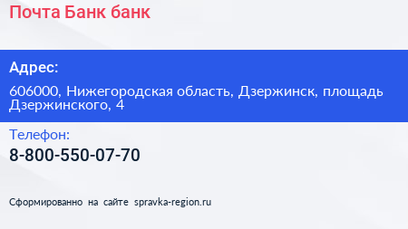 Почта Банк, банк по адресу 606000, Нижегородская область, Дзержинск, площадь Дзержинского, 4 в дальнейшем Организация, размещена в следующих категориях: