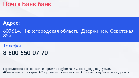 Почта Банк, банк по адресу 607614, Нижегородская область, Дзержинск, Советская, 85а в дальнейшем Организация, размещена в следующих категориях: